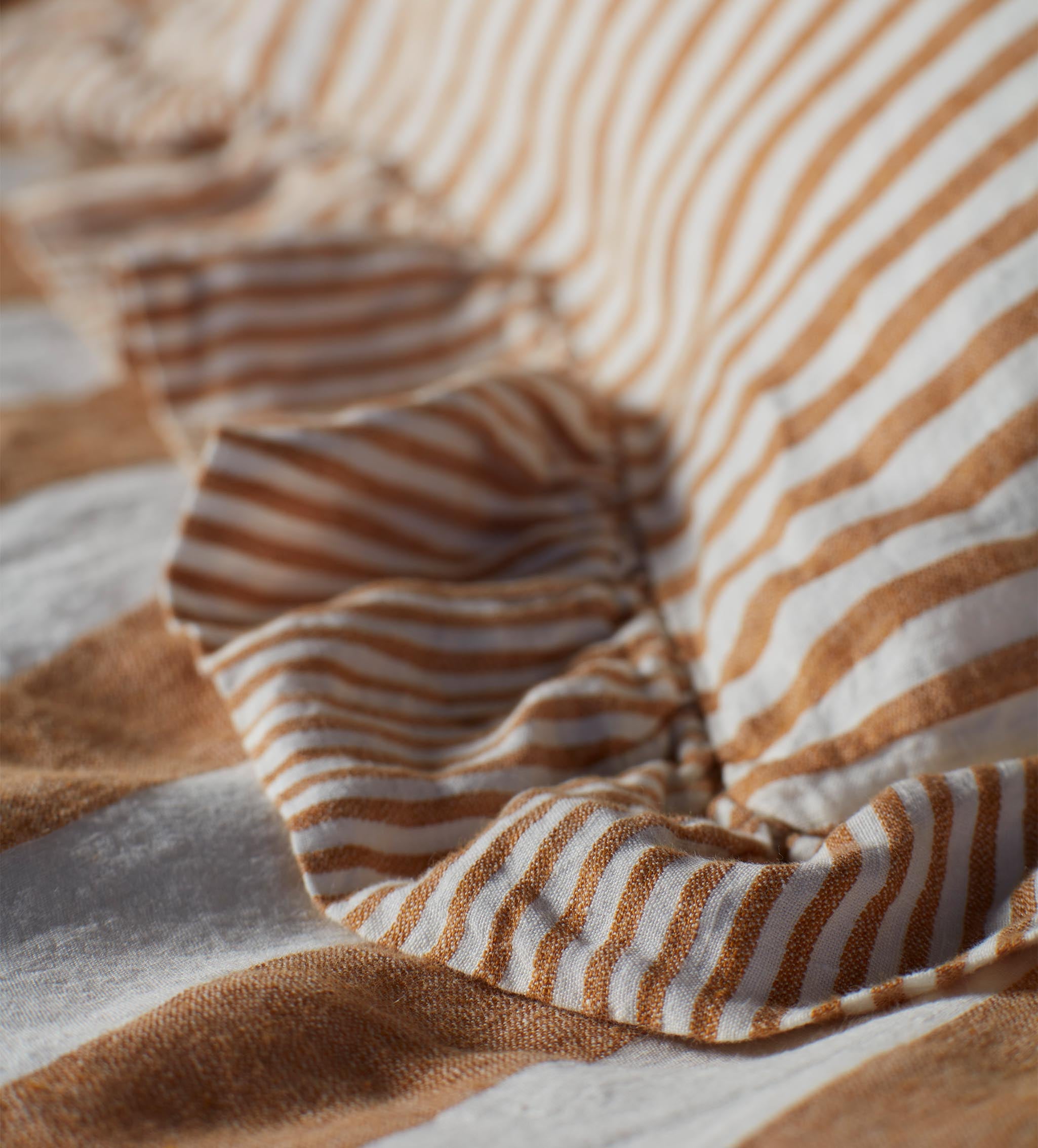If you’re looking for the perfect finishing touch for your amber bedding, look no further than our Amber Cora Wide Stripe 100% Linen Frill Edge . Perfectly playful, we’re a little bit in love with its warm amber and soft off-white stripe, accented by a contrasting narrower stripe on the frill.